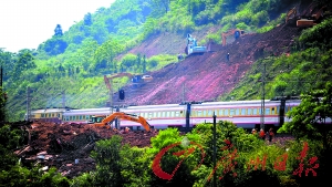 昨日上午8时,记者重返列车脱线的事故现场,在发生塌方的山体地段,记者十分清楚地可以看到一个凹陷进去十来米的大坑,好像山体被挖去了一大块,事故现场已经基本清理完毕。
