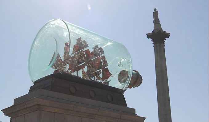 中新网5月25日电 据外电报道,24日,一件新艺术品在英国伦敦特拉法加广场上揭幕,开始展览。这是一个外观和小玩具一模一样的“瓶中船”,但实际上是一个长4米多、宽3米多的巨大艺术品。