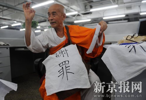 5月23日,在新京报社,岩田隆造写下“谢罪,绝食三天,日本僧,岩田”十一个大字,表明此次中国行上的目的。杨杰 摄
