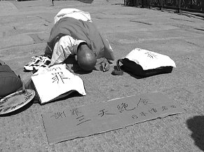 在桥上,岩田把两张写有“谢罪”的白布,摆在最显眼的位置。随后,他摊开手中的纸板。“三天绝食、日本僧、岩田”几个字分外醒目。岩田脱掉鞋子,跪下、叩首、起身、抬头仰望,双手合十、再次叩首,连续重复着这些的动作,表情平静而严肃。