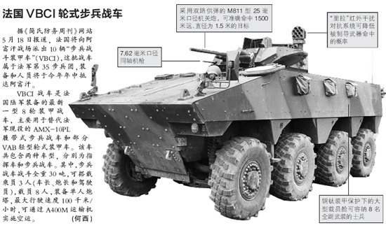 VBCI战车是法国陆军装备的最新一型8轮装甲战车,主要用于替代法军现役的AMX-10PL履带式步兵战车和部分VAB轻型轮式装甲车。该车共包含两种车型,分别为指挥车和步兵战车。其中,步兵战车战斗全重30吨,可搭载乘员3人(车长、炮长和驾驶员),载员8人,装备单人炮塔,最大行驶速度100千米/小时,可通过A400M运输机实施空运。(何西)