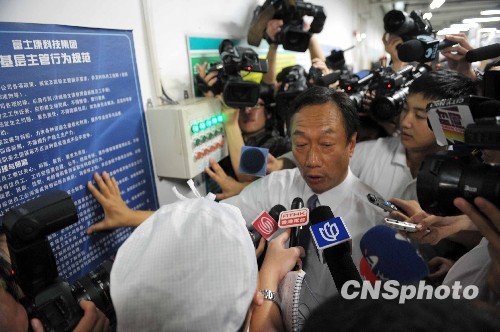 5月26日上午,富士康科技集团总裁郭台铭会见海内外200多名媒体记者,并主动带记者参观社区、厂区、车间、宿舍楼、员工关爱中心等,郭台铭所到之处刮起阵阵“旋风”,被媒体记者围堵追访。 中新社发 陈文 摄