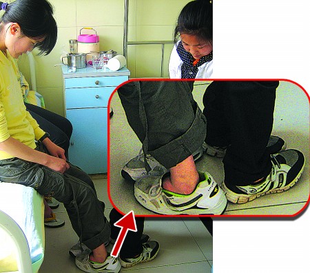 24日上午10点,医生过来给两人会诊,院春脱下鞋子,脚背上的老茧一下子就露了出来。两人的双脚都反长了十几年,已经完全变形了。由于常年脚背着地,两人的小腿也变得特别细。现在两人都是双脚脚背着地,把扭曲的脚掌向上翻转然后才能穿进鞋子里面。艳春说,尽管这样,走路还是只能走很短的时间,时间一长,就会疼得厉害。