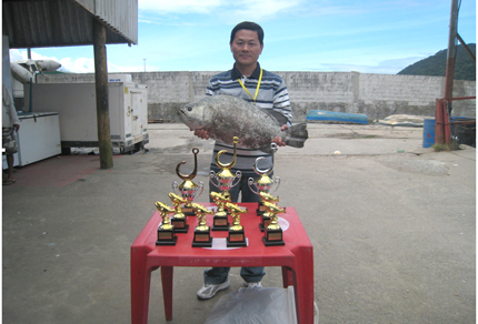 23日中午,大家满载着喜悦和收获陆续回到岸边。在简短的颁奖仪式上,颁发了奖杯和奖金。会长吴耀宙先生以单条最重获得第一名,成绩是7.18kg,并获得奖金800元;获得第二名的是来自韩国的DANIEL李先生,成绩是5.98 kg,并获得奖金500元;获得第三名的是ANDRE陈先生,成绩是5.00 kg,并获得奖金300元。7条船上的优胜者也得到奖杯和纪念品。