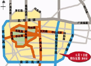 从2010年6月1日起,全天24小时禁止未持有绿色环保标志的汽车通行以下市区范围(含北环高速公路增槎路至广氮段、机场高速公路黄石路至北环高速公路段,不含东南西环高速公路、华南快速干线、佛山市辖区内道路):