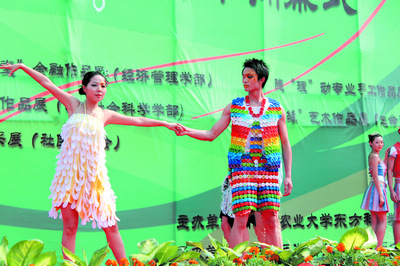 当日的T形台上,一名大学生身穿的用废弃饮料瓶盖制成的衣服让现场观众惊叹不已。据介绍,这是农大十几位大学生花了一个月的时间,收集3000多个各种颜色的废弃饮料瓶盖,用铁丝穿起来制作成的一套绚丽夺目的服装。该作品设计者曹芷铭同学说:“我们希望通过这套服装的展示,增强人们的环保意识,倡导人们从细节去注重低碳生活。”