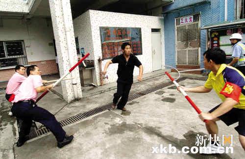 木棍、钢叉、钢盔、防护盔甲……在聚德东小学,记者看到了全副武装的校卫队。校长翁少静表示,学校目前有三个全职保安,24小时值班。此外,每到重点时段,派出所的巡逻警还会到校门口执勤。而学校最近更是成立了“全男班”的校卫队。“我们挑选了一些青壮年老师参加。”校长表示,该校校卫队一共七人,队长就是副校长,老师全部都是义务担任,没有任何加班费。