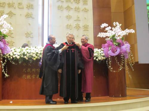 仪式由陈爱蒂博士主持,并宣读东南亚圣道神学院院长的议决书,然后由黄彼得博士和郭民向杨清披戴博士披肩,接着由傅子洁牧师颁发荣誉学位证书。