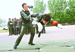 除了心理测试,体能和反应能力培训也是必须的。在培训基地,受训保安正模拟“持刀男子闯校园”情形,进行擒拿术演练。保安公司相关负责人透露:“作为特训的必修课之一,模拟实战演练,更能锻炼保安人员对可疑、不法分子的识别、控制和快速反应能力!”