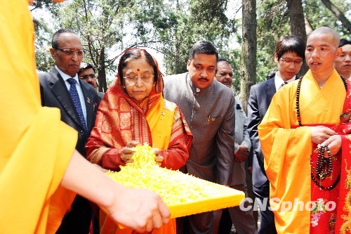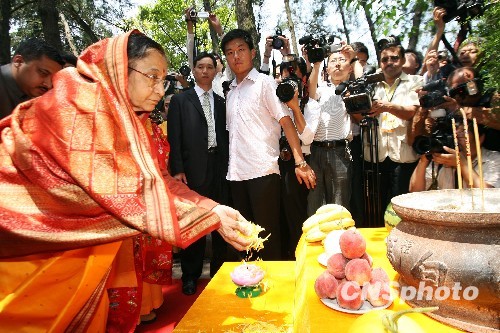 印度总统普拉蒂巴·德维辛格·帕蒂尔29日来到“中国第一名刹”河南省洛阳白马寺参访,并出席印度风格佛殿的落成仪式。她表示,印度风格佛殿是印中人民友谊的象征,“我会永远牢记的!”