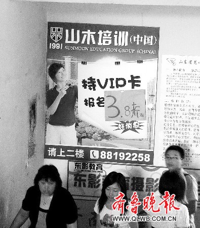 5月27日,山木培训一处招生点打出大幅降价的广告。 本报记者周青先摄