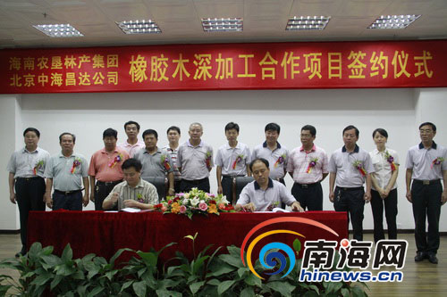 南海网5月30日消息(南海网记者陈望特约记者潘垣臻)5月28日下午,海南农垦林产集团公司与北京中海昌达装饰工程公司签署“橡胶木深加工合作项目”协议,计划年更新橡胶木1万亩以上,实现销售收入1亿元。这份协议必将有助于我省橡胶木结束物美价低的历史。