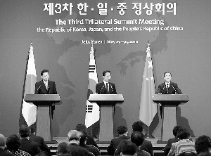 据新华社韩国济州岛5月30日电 第三次中国、日本、韩国领导人会议29日至30日在韩国济州岛举行。中国国务院总理温家宝、日本首相鸠山由纪夫和韩国总统李明博出席会议。三国领导人就未来十年三国合作发展方向及重点合作领域进行了规划,就当前重大国际和地区问题深入交换了意见,达成广泛共识。