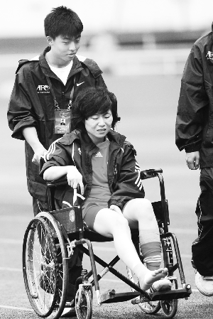 本报成都讯 (特派记者赵宇)傍晚6时半,女足前锋徐媛坐在轮椅上,被队医老孟推进了酒店大堂。她的右腿在比赛中扭伤,初步诊断为韧带撕裂,至少要休息半个月。