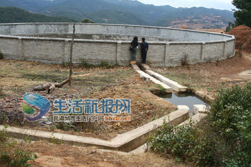 而正是这年小康水利工程的推行,面对此次大旱,村里47户人喝水都不成问题,而且每家都有一亩地能灌溉。罗绍生带着我们察看了村里的水利设施。石桥河新村位于山顶的一个最大的露天水池里,存储了大约半池水,一旁的入水管里,还有一小股水源缓缓流入其中。全村共兴建了6个水池,最大的容量近3000立方米,最小的有100立方米。全村47户人家,饮用水来自一个近百立方米的封闭水池。它的水源是一个距离村子约3.6公里远的山泉,三面水泥筑成的水槽,将山泉水引入池中。