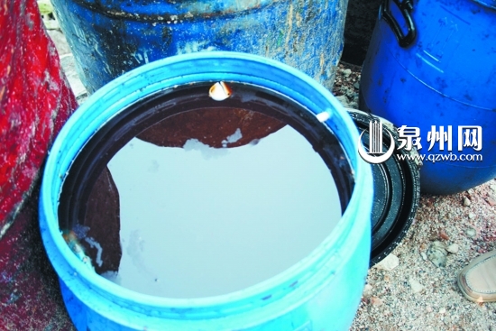 塑料桶里漂浮一层混浊的油脂黑得吓人