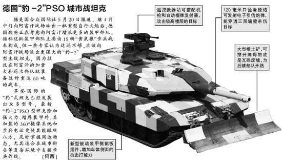 享誉国际的“豹”式坦克已经发展出众多型号,最新“豹-2”PSO型坦克除加强火力、增厚装甲外,其加装的360°摄像系统和步兵电话更使其能眼观八方,及时掌握周边动态,尤其适合在城市街垒等复杂环境中支援步兵作战。(何西)