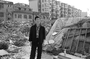 安徽阜阳市双清路和阜王路交叉口南侧,一片废墟边上,搭着一个棚子。棚子是市民陈少远夫妇搭的。这里本是他们的家,2008年底被强拆。他们轮流在棚子里“看守”废墟,阻止开发商的房地产项目施工。