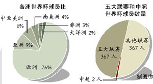 在所有世界杯参赛球员中,来自五大联赛的占到了49.9%。中超联赛以2名球员入选的成绩,排在所有贡献世界杯球员联赛人数的第38位,这相比于中国足球国际足联第84位的世界排名显得难能可贵 (这两名球员是效力于大连实德的韩国外援安贞焕与效力于杭州绿城的洪都拉斯外援萨比勇)。