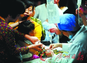 昨日,记者来到市儿童医院,因这段时间天气变化大,因感冒、发烧、腹泻到医院看急诊的患儿很多。在医院门诊大厅,有不少拖着吊瓶的父母和孩子。家住白云区的家长李先生说孩子发烧,来医院检查后医生说要打针,直接就开了静脉注射药。医院还为需要注射的患者开了专用的病室。