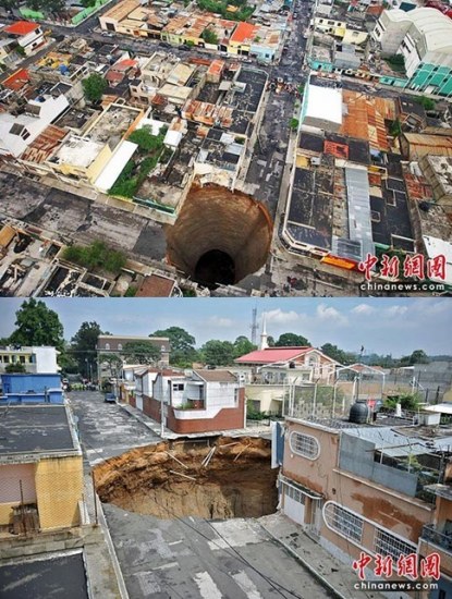 中新网6月2日电 据外电报道,热带风暴“阿加莎”横扫中美洲,到目前为止已造成至少180人死亡。受到连场暴雨影响,危地马拉城一处出现地面下陷,形成一个深60米、直径30米的地洞,专家表示,虽然还没有对该地洞的形成做出最终解释,但可以肯定的是,这不是地质变动,不是地震的表现。