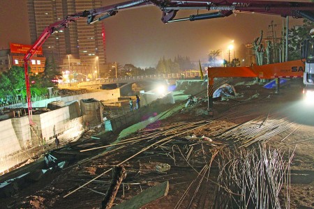 3日凌晨1点03分,记者在阳光新路上远远看到北方有灯光。记者朝着灯光前进,在阳光新路北首的振兴街银座中心工地,一辆混凝土车停在工地西门口,在东门内,一辆货运车正在倒车。