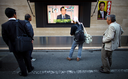 日本民众昨天在街头观看菅直人发表演讲,日本从此进入“菅直时代”。