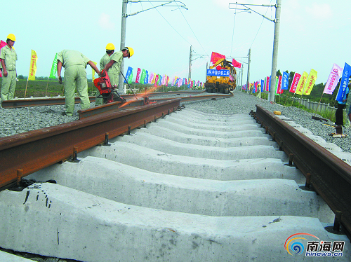 本报琼海6月5日电(记者王成诚摄影报道)今天对东环铁路的建设者来说是个大日子,下午3点18分,中铁三局的铺轨机在位于琼海中原境内的DK137+835接轨点将右幅铁轨最后一根钢轨铺下,右幅线路全线贯通,海南人魂牵梦绕的东环铁路终于实现南北连接。