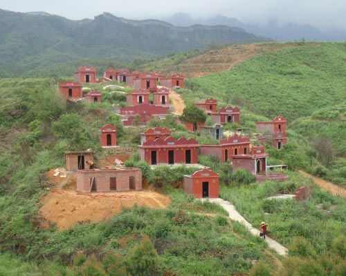 奇特的建筑从水边一直延伸到山腰,乍看给青山绿水带来一丝古典情调。如果对客家风俗不甚了解,外地人极易把这种当地称为“阴城”的豪墓当作小别墅,即使靠近也难分辨。