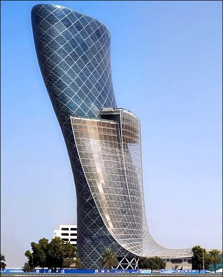 阿联酋首都阿布扎比在建的“首都门”(Capital Gate)已经被吉尼斯世界纪录认证为“世界上最斜的人造塔”,它的倾斜角度是意大利著名的比萨斜塔的4倍。