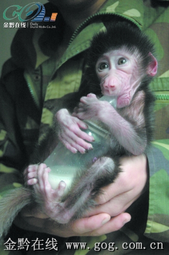金黔在线讯 贵阳森林野生动物园一只小狒狒,出生不到一天,便被母亲抛弃,生命垂危,两名男饲养员只好当起临时“奶爸”,照顾小狒狒。在两名“奶爸”的精心照料下,小狒狒顺利成活,如今已健康满月。