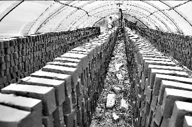 昨日,记者驱车前往江夏区金口街青菱村,在村民指点下,在金水河北岸河堤发现了这座砖瓦厂。土窑背后,厂区内盖起20座塑料薄膜大棚,—位老太婆正在其间收拾晾干的成片瓦坯,旁边几个大棚里堆码着层层砖坯。