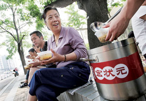看到“宏状元”的标志,在考场外休息等候的家长们立刻兴奋了起来。“这附近还真有‘宏状元’,早晨孩子还念叨要喝状元粥呢!”一位考生家长一边说着,一边上前领了两碗绿豆汤。“我得给孩子留一碗,图个吉利”。
