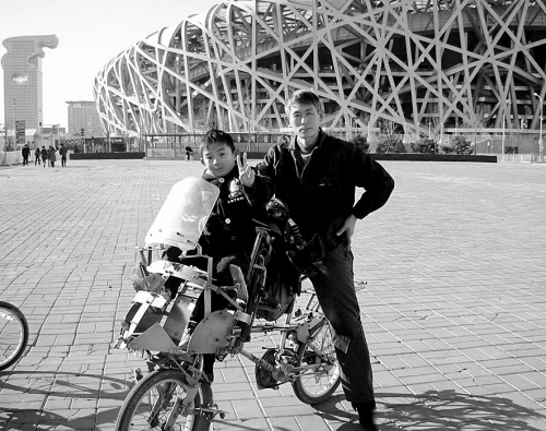 2008年,杨先生骑着“变形金刚”,载着6岁的儿子,一路游玩一路骑行,用了整整10天的工夫到达北京,看到了鸟巢、水立方、天安门。