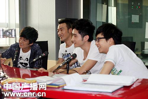 6月9日,超级新光大道冠军胡夏和季军“三帅”做客文艺之声《从文化开始》(左起:牟少帅、李广博、蒋一帆、胡夏)。四人阳光帅气,对主持人的问题有一说一,没有一般艺人的矫揉造作,直播间中不时响起爽朗的笑声。四人坦言参加选秀比赛后没有时间回家,很想念家人。(中广网记者张璇 摄)
