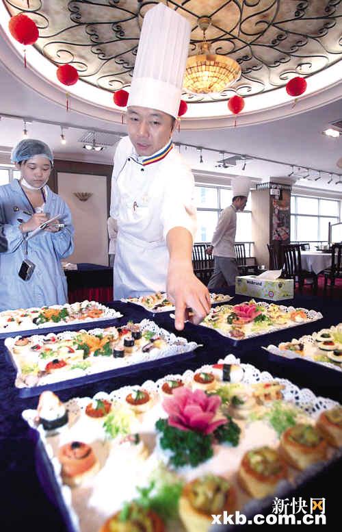 记者随后进入了试餐室。两张五米长的大桌摆满了最新研制出来的亚运会餐食,卖相极其诱人。比如,在一个乒乓球大小的小饼上,12块小如指甲盖的牛肉被码成了花朵的形状,看得人垂涎欲滴。