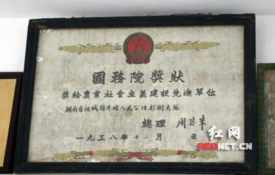 红网郴州6月10日讯(通讯员 刘小林 曹雄清 陈建远 曹航)日前,在湖南省郴州汝城县三星镇杉树园村(原井坡公社杉树大队)发现了一块周恩来亲笔签名奖牌。奖牌是1958年国务院表彰该县当时杉树园大队农业生产先进的,周恩来总理在北京钓鱼台宾馆设宴并亲自颁奖。
