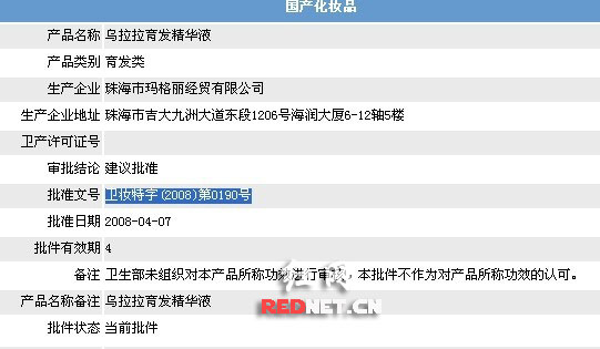 记者随后也登陆了国家食品药品监督管理局网站,在首页右下“数据查询”的“国产化妆品”栏目中,输入“卫妆特字(2008)第0190号”,确实如网友帖中反映的,该批号为一款珠海市玛格丽经贸有限公司生产的育发类产品——乌拉拉育发精华液,批准日期为2008年4月7日,备注一栏中写明:卫生部未组织对本产品所称功效进行审核,本批件不作为对产品所称功效的认可。而记者了解到,该公司也同为“努比亚永久黑”的生产商。