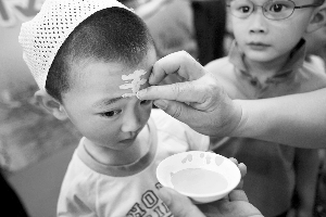 房檐插艾草,雄黄酒画额。昨日上午,东外大街北社区的少数民族居民举办端午节民俗活动,作为满族端午的传统项目:社区7位小朋友的额头用雄黄酒画出“王”字,寓意吉祥。据满族居民介绍,人们用雄黄酒在小儿额头画“王”字,一借雄黄以驱毒。二借猛虎以镇邪。