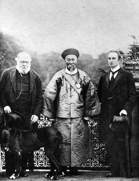 1896年,李鸿章成为清代大臣中第一个进行环球访问的人。访英期间,李鸿章与英国首相兼外交大臣索尔兹伯里(左)、英国外交副大臣寇松(右)合影