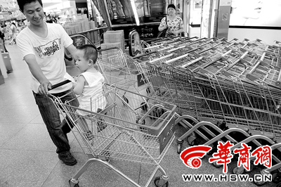 西门外一超市,一位男子用购物车推着小孩去选购商品 本报记者 赵航 摄
