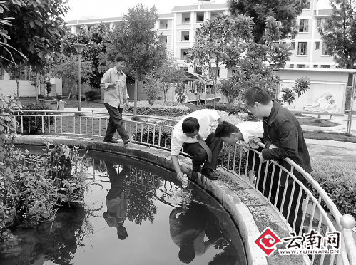 在学生的引路下,记者走进保山市第一中学男生宿舍区。宿舍区虽然不大,但却种有很多种植物,环境十分幽雅。发现桃花水母的水池,就在男生宿舍区中,水池上有一座小假山,整个小水池总面积不足5平方米。