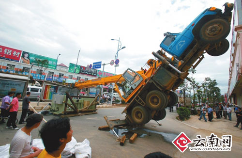 货运板车司机还说,民警赶到后询问了事故情况,还检查了每一位驾驶员的证件,可一转眼的功夫,操纵吊车的那位女驾驶员就不见了踪影。直到下午1时55分,经过民警协调调来了两辆20吨的吊车,准备将昂头翘在半空的吊车扶正,谁知刚刚牵动倾倒的吊臂,吊车竟然一个“鲤鱼打挺”,轰地一声自己翻了过来,与钢缆相连的吊钩在空中甩了几个圈,把一旁的人们又吓出一身冷汗。