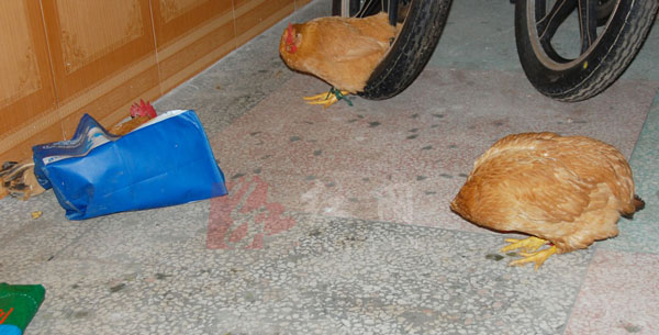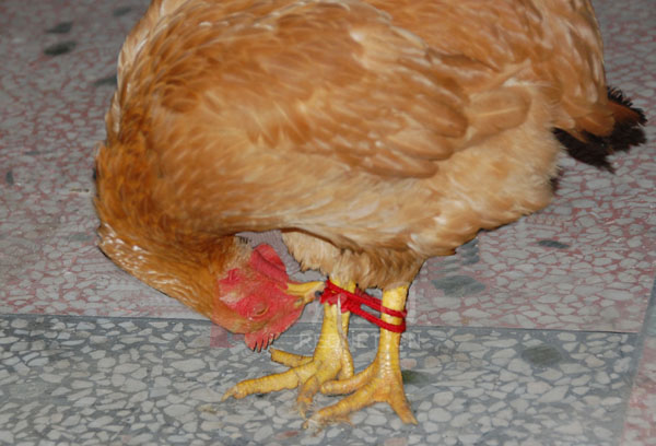 6月17日下午,浏阳市北盛镇某摩托车店。摩托车店主人缚着3只鸡放在地上,准备送亲戚,其中两只鸡被缚后在地上一动不动,而另一只母鸡却一直在用嘴啄缚腿的绳子,其动作之准确,令人震惊。经过它的努力,居然将绳索结啄松了,正当它大功告成之时,主人发现了它的“伎俩”,将它重新抓起,再将绳索扎个死结。