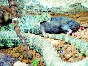据保护区专家李石洲介绍,2007年采集的第一条莽山烙铁头蛇经过2年多的驯养已经可以确定人工养殖取得了成功。刚送到保护区时仍比较瘦弱的这条烙铁头蛇如今已长成了一条“高大帅气”的“小王子”,肤色鲜艳,体重增加,胃口不错。