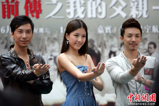 6月19日,《叶问前传》的主演世界武术冠军杜宇航(左起)、新晋演员陈嘉桓和电影主题曲“千尺浪”主唱张继聪在香港一家商场宣传咏春拳术。继功夫电影《叶问》之后推出的又一巨作《叶问前传》将在6月24日上映。中新社发 洪少葵 摄