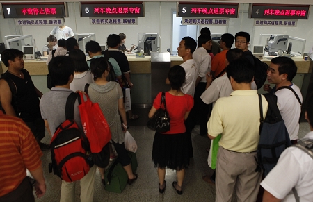 | 退票窗口挤满了受南方暴雨影响的旅客。 早报记者 赵昀 实习生 苗奥 图 |