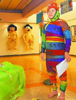 中国台湾网6月21日消息 据台湾《苹果日报》报道,台湾肉贩兼行为艺术表演工作者阮仁珠、吕健志酷爱裸体表演,昨日中午两人在高雄市社会局妇女馆“脱序”演出。阮仁珠以彩色丝布包裹全身,由吕健志动手拆解,3分多钟后全裸露出身体,高雄市社会局妇女馆人员吓得抓布飞扑替她遮掩,阮仁珠不满指控:“社会太荒谬!错把裸体当色情!”称将拜访高雄市长陈菊并邀她看展。