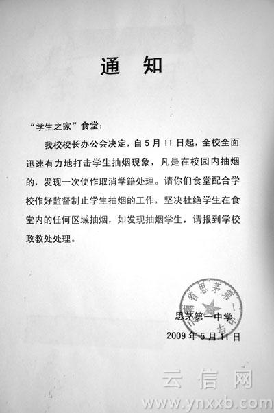 2010年6月1日,普洱市思茅区教育局向区属23所校园发出《思茅区教育局关于在校园内公共场所禁烟的通知》(以下简称《通知》)。“这是云南省第一家自发进行控烟工作的教育单位。”云南省健康教育所控烟办公室主任赵白帆说。