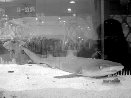 店主人阿克说,买回来时只知道这是国外人工繁殖的。这种白鳍鲨主要分布在印度洋及太平洋珊瑚区海域,平时性情温和,但偶尔也会攻击人。